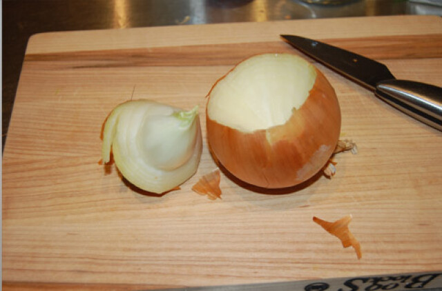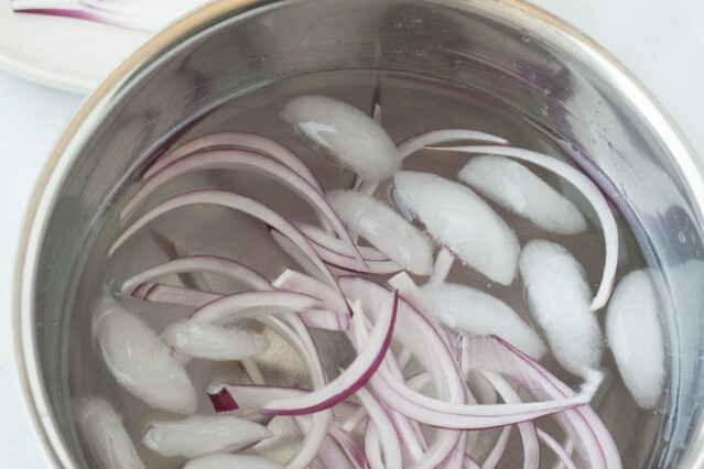 6) कांद्याचे दोन तुकडे करून त्याचा पापुद्र काढून टाका. त्यानंतर कांदा थंड पाण्यात टाकून ठेवा. अर्धा तासानं तुम्ही कांदा कापायला घेऊ शकता.