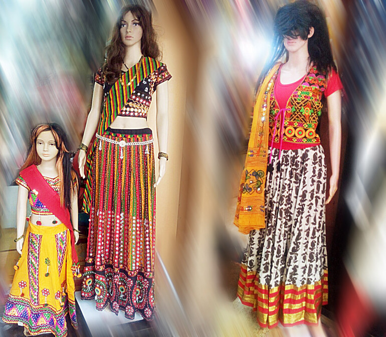 दांडियासाठी घेरदार घागरा-चोली आणि लच्चेदार चुनरी या पेहरावाला तरूणी प्राधान्य देतात. घागरा-चोलीवर बांधणी प्रिंट, त्यावर अबला वर्कचे भरगच्च भरतकाम. त्यामुळेच घागरा चोलीचा हा साज तरूणींमध्ये लोकप्रिय आहे. घागऱ्यांमध्ये राजस्थानी, बांधणी प्रिंटचा वापर केला जातो. एवढंच नाही तर घागऱ्याला कवड्या, कच्छी वर्क, आरसे, मोती लावून सजवले जाते. त्यामुळे कॉलेज तरूणींमध्ये तर घागरा-चोलीची प्रचंड क्रेझ आहे. फक्त घागरेच नाही, तर चोलीमध्ये देखील वेगवेगळे प्रकार आहेत. हल्ली बॅकलेस चोलीची जास्त चलती आहे. यासोबतच बाजारात स्लिव्ह्जलेस आणि डिप यू नेक अशा चोलीसुद्धा उपलब्ध आहेत. १५०० पासून ते ४००० हजारापर्यंत किमतीच्या घागरा-चोली बाजारात उपलब्ध आहेत.