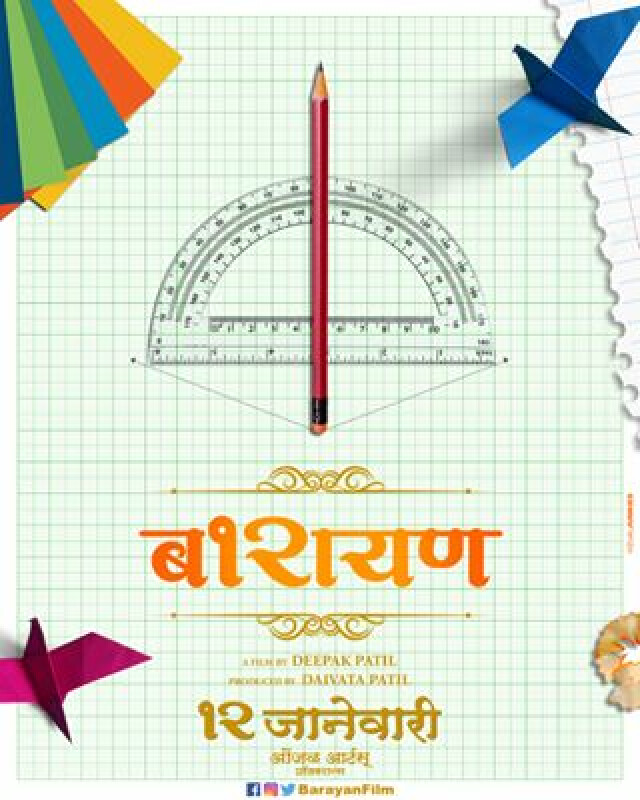 काही दिवसांपूर्वीच 'बारायण' चित्रपटाचा पोस्टर प्रदर्शित करण्यात आला होता. पोस्टरवर विशालकोन, पेन्सिल, ओरीगामी कागद, आलेख पेपर असे शैक्षणिक साहित्य पाहायला मिळत आहे. या चित्रपटात कोणते कलाकार आहेत याची माहिती मिळाली नाही. पण चित्रपटाचे नाव आणि पोस्टरचा लूक यामुळे प्रेक्षकांच्या मनात अधिक उत्सुकता निर्माण झाली आहे. १२ जानेवारीला हा चित्रपट प्रेक्षकांच्या भेटीला येणार आहे.