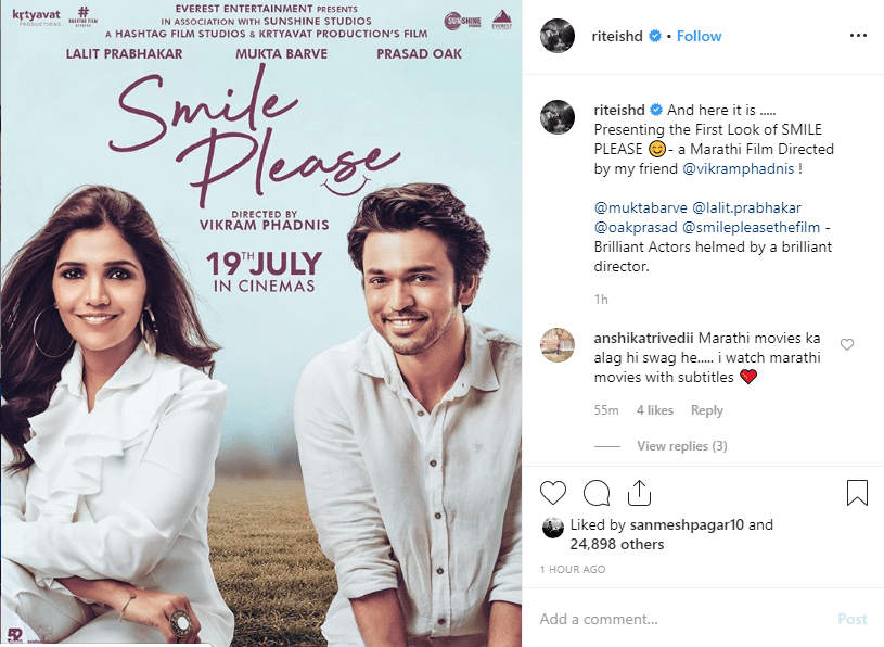 खरं तर 'स्माईल प्लीज' नावाचा एक नवा कोरा मराठी चित्रपट प्रेक्षकांच्या भेटीला येणार आहे. या चित्रपटाचं पहिलं पोस्टर रितेशनं नुकतंच सोशल मीडियावर लाँच केलं आहे. विक्रम फडणीस दिग्दर्शित 'स्माईल प्लीज' या चित्रपटाच्या पोस्टरमध्ये मुक्ता बर्वे आणि ललित प्रभाकर यांच्या चेहऱ्यावर स्मितहास्य दिसत आहे. आयुष्यातील हसण्याचे क्षण अधोरेखित करणारं हे पोस्टर निश्चितच डोळ्यांना सुखावणारं आहे. प्रत्येकाच्या आयुष्यात चढउतार हे येतच असतात, परंतु त्याकडं सकारात्मकतेनं बघत, जीवनाची पुनर्मांडणी करण्याची गरज आहे.