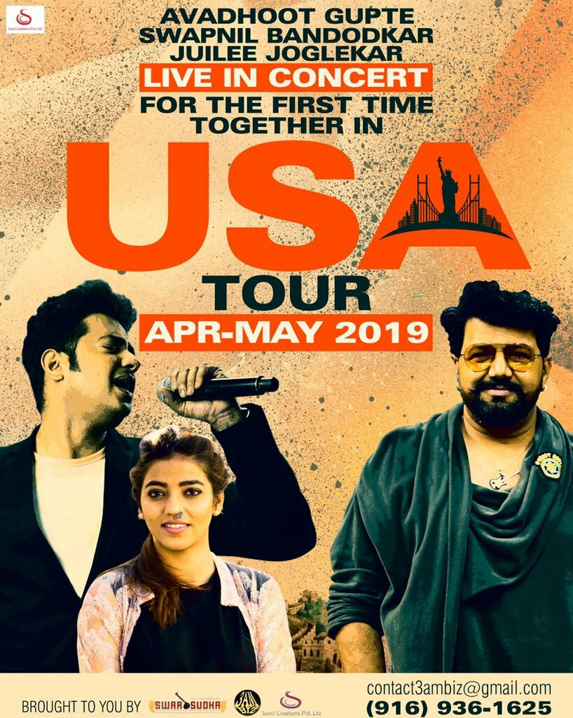 महाराष्ट्रातल्या सांगीतिक परंपरेचा ठेवा सातासमुद्रापार नेत तिथल्या मराठी जनतेला अस्सल मराठी मातीतल्या गाण्यांचा आस्वाद घेता यावा यासाठी मराठीतील तीन आघाडीचे गायक अमेरिका वारीवर निघाले आहेत. सुरेल क्रिएशन व ३ एएमबीझ यांच्या संयुक्त विद्यमानं अमेरिकेत 'अवधूत गुप्ते- स्वप्निल बांदोडकर लाइव्ह इन कॉनसर्ट'चं आयोजन करण्यात आलं आहे. या निमित्तानं अमेरिकेतील १२ वेगवेगळ्या शहरांत प्रथमच मराठीतील पॉप गाण्यांचे लाइव्ह सूर घुमणार आहेत.
