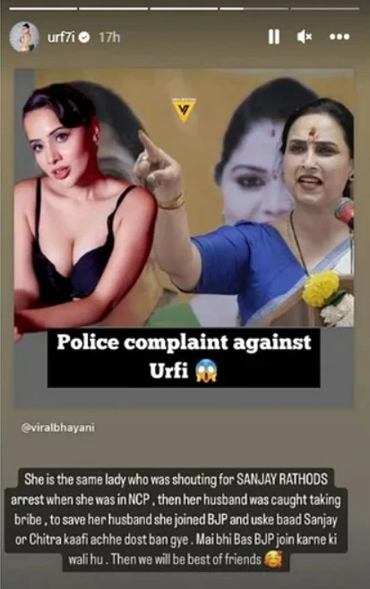 उर्फीने तिच्या या पोस्टमधून चित्रा वाघ यांना संजय राठोड प्रकरणाची आठवण करून दिली आहे. ‘ही तीच महिला आहे ज्या राष्ट्रवादी काँग्रेसमध्ये असताना संजय राठोडच्या अटकेसाठी ओरडत होत्या. त्यानंतर लाच घेतल्यामुळे त्यांचा पती निशाण्यावर आला. पतीला वाचवण्यासाठी त्यांनी भाजपमध्ये प्रवेश केला. त्यानंतर संजय आणि चित्राजी एकमेकांचे चांगले मित्र बनले. मीसुद्धा भाजपमध्ये प्रवेश करणार आहे. त्यानंतर आम्ही दोघीसुद्धा चांगल्या मैत्रिणी होऊ’, असा उपरोधिक टोला तिने इन्स्टाग्रामवरील पोस्टमध्ये लगावला.