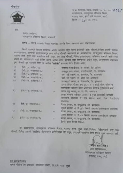 विदर्भ पाटबंधारे विकास महामंडळांतर्गत सुरू असलेल्या सिंचन प्रकल्पांच्या चौकशीची फाईल बंद करण्याबाबतच्या अंतिम चौकशी अहवालाचं अवलोकन लाचलुचपत प्रतिबंध विभागाच्या महासंचालकांनी केलं आहे. भविष्यात आवश्यकता भासल्यास सरकारने काही नियम केल्यास किंवा न्यायालयाने आदेश दिल्यास या प्रकरणांची पुन्हा चौकशी करण्यात येईल, असं पत्रकात म्हटलं आहे.