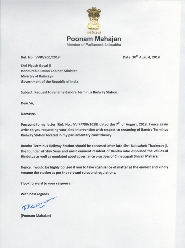 पूनम महाजन यांनी सुरेश प्रभू रेल्वेमंत्री असताना २०१७ साली नामकरणाबाबतचा प्रस्ताव दिला होता. राज्य सरकारला देखील हा प्रस्ताव पाठवण्यात आला आहे. राज्य सरकारनेही वांद्रे टर्मिनसच्या नामकरणाचा हा प्रस्ताव रेल्वे मंत्रालयाला पाठवण्याचं मान्य केलं आहे.