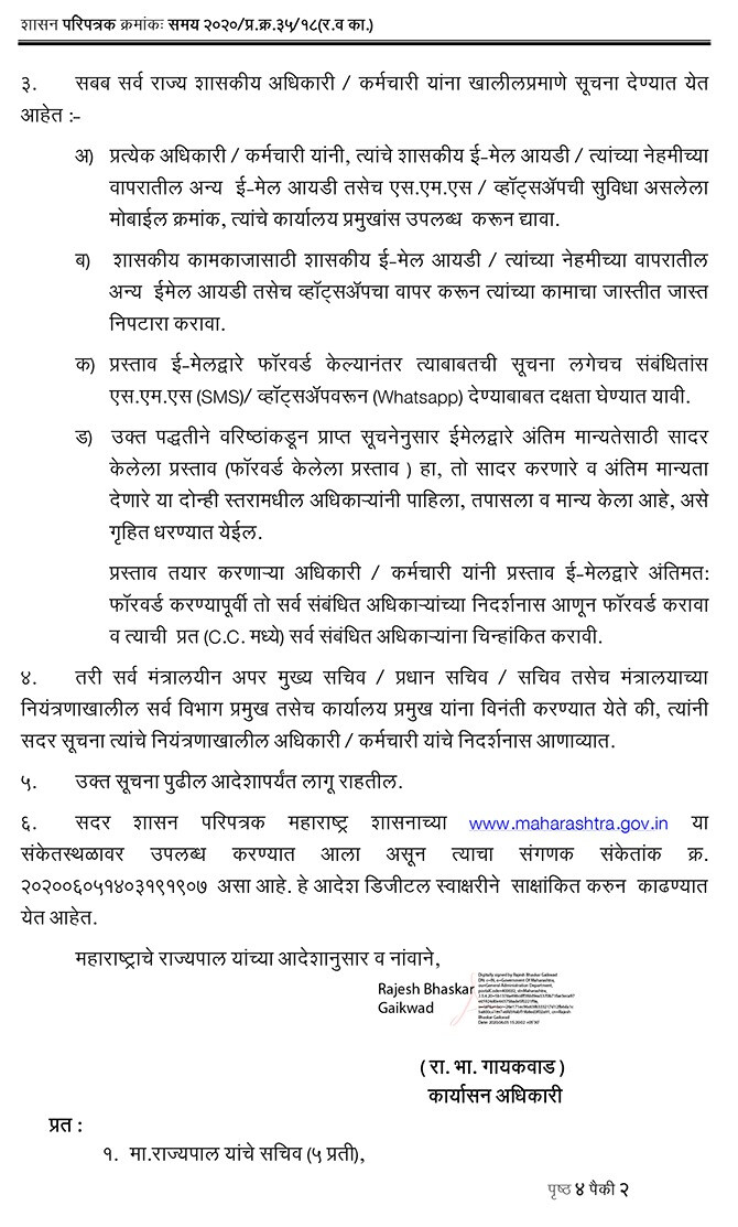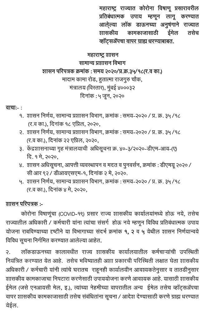 लाॅकडाऊनच्या कालावधीत राज्य शासकीय कार्यालयातील कर्मचाऱ्यांची उपस्थिती नियंत्रीत करण्यात येत आहे. तसंच भविष्यातही अशा प्रकारची परिस्थिती लक्षात घेता शासकीय अधिकारी/कर्मचारी यांनी त्यांच्या घरातच राहून कार्यालयीन आवश्यकतेनुसार आणि तातडीनुसार शासकीय कामकाजाचा निपटारा करण्यासाठी उपाययोजना करणं आवश्यक आहे. यासाठी शासकीय ई-मेल (जसं एनआयसी मेल इ.) त्यांच्या नेहमीच्या वापरातील अन्य ई-मेल तसंच व्हाॅट्सअॅपचा वापर शासकीय कामकाजासाठी तसंच संबंधितांना सूचना/आदेश देण्यासाठी ग्राह्य धरण्यात येईल.