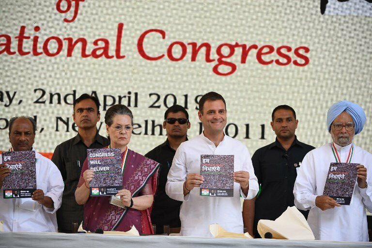 लोकसभा निवडणुकीसाठी काँग्रेसचा 'जन आवाज' जाहीरनामा प्रसिद्ध करण्यात आला आहे. ‘हम निभाएंगे’ असं जाहीरनाम्याच्या मुखपृष्ठावर आश्वासन देण्यात आले आहे. नवी दिल्लीच्या काँग्रेस मुख्यालयात काँग्रेसनं मंगळवारी पत्रकार परिषद आयोजित करून हा जाहीरनामा प्रसिद्ध केला. त्यावेळी काँग्रेस अध्यक्ष राहुल गांधी, सोनिया गांधी, मनमोहन सिंह, पी. चिदंबरम आणि सुरजेवाला उपस्थित होते.