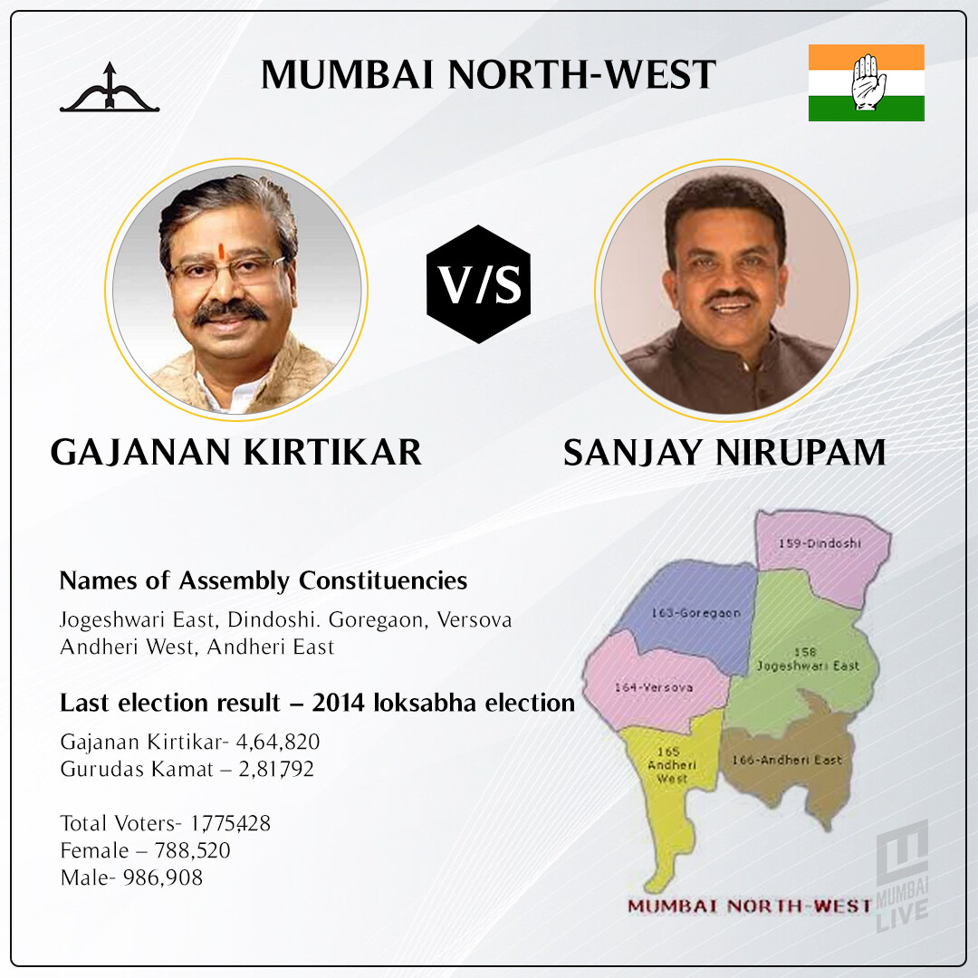 उत्तर पश्चिम लोकसभा मतदारसंघातून शिवसेनेचे उमेदवार गजानन किर्तीकर आणि काँग्रेसचे संजय निरूपम यांच्या मुख्य लढत आहे. मुंबई काँग्रेसमध्ये गटबाजी करण्याचा आरोप लावण्यात आल्याने लोकसभा निवडणुकीच्या तोंडावर निरूपम यांचं अध्यक्षपद गेलं. पण सोबत काँग्रेसने दिवंगत नेेते गुरूदास कामत यांच्या जागेवर निरूपम यांना तिकीट दिलं.