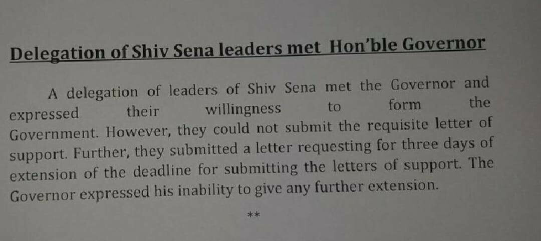 परंतु या नेत्यांना काँग्रेस आणि राष्ट्रवादीच्या पाठिंब्याचं पत्र राज्यपालांना वेळेत देता आलं नाही. त्यामुळे शिवसेनेच्या नेत्यांनी पाठिंब्याचं पत्र देण्यासाठी राज्यपालांकडे वेळ वाढवून मागितली. परंतु वेळ वाढवून देण्यास राज्यपालांनी नकार दिल्याने शिवसेनेच्या नेत्यांना तिथून काढता पाय घ्यावा लागला.