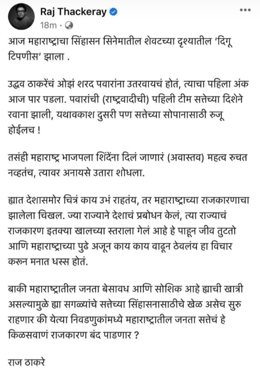बाकी महाराष्ट्रातील जनता बेसावध आणि सोशिक आहे ह्याची खात्री असल्यामुळे ह्या सगळ्यांचे सत्तेच्या सिंहासनासाठीचे खेळ असेच सुरु राहणार की येत्या निवडणुकांमध्ये महाराष्ट्रातील जनता सत्तेचं हे किळसवाणं राजकारण बंद पाडणार? असा महत्त्वाचा प्रश्न देखील राज ठाकरेंनी उपस्थित केला आहे.
