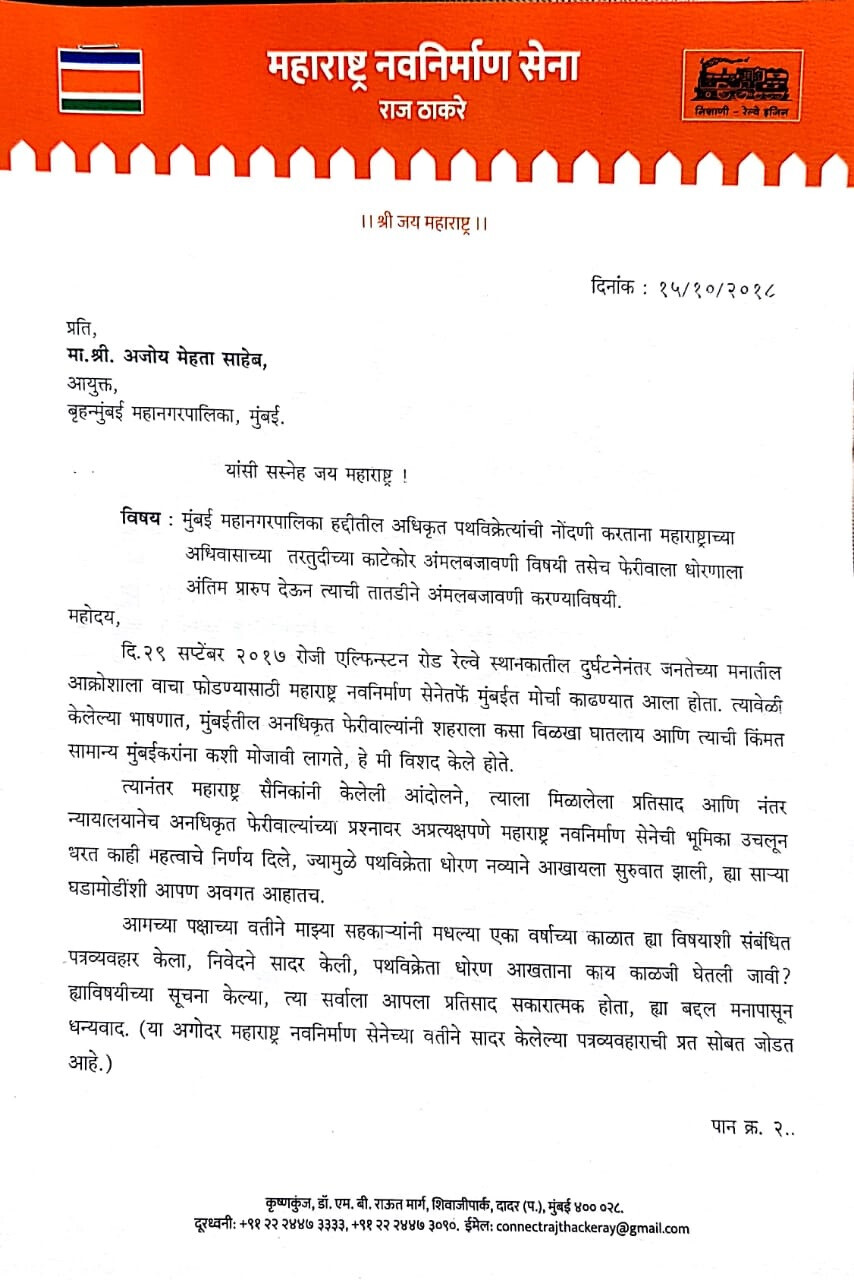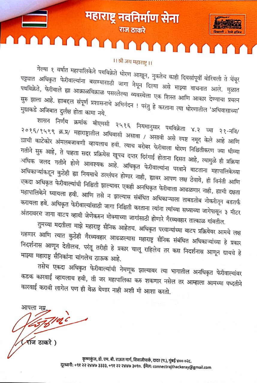 त्यामुळे फेरीवाला धोरणाच्या नियमानुसार अधिकृत फेरीवाल्यांकडून डोमिसाईल घेतल्यावरच त्यांना जागा देण्यात यावी तसंच ही प्रक्रिया जलदगतीने राबवण्यात यावी, अधिकृत परवाने वाटताना महापालिका अधिकाऱ्यांकडून कुठेही नियमांचं उल्लंघन होणार नाही याची काळजी घ्यावी, अनधिकृत फेरीवाल्यांवर कारवाई करावी, नाहीतर, मनसेला पुन्हा एकदा आपल्या पद्धतीने कारवाई करावी लागेल, असं या पत्रात नमूद करण्यात आलं आहे.