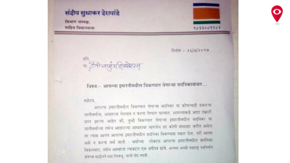 मनसे नेते संदीप देशपांडे यांनी श्री चामुंडा रिअॅल्टर्स यांना शनिवारी नोटीस बजावली आहे. संदीप देशपांडे यांनी या नोटीसच्या मध्यातून चामुंडा बिल्डर यांना शाकाहारी-मांसाहारी हा भेद करत आपण सदनिका विक्री करु शकत नाहीत यावर खडे बोल सुनावले आहेत. त्याच बरोबर हे नियम बदलले नाहीत तर मनसे स्टाईलमध्ये आंदोलन करू असा इशाराही देशपांडे यांनी दिला.