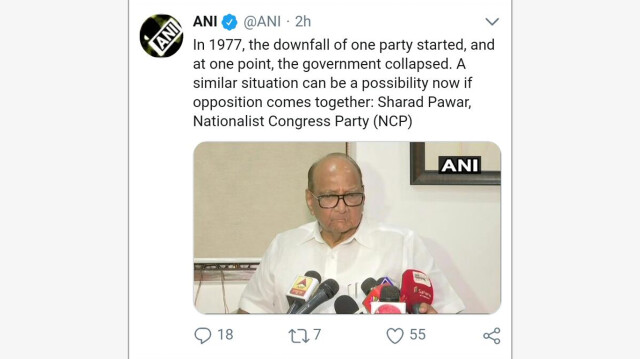 १९७७ मध्ये सर्व विरोधकांची जशी एकजूट झाली होती तशीच एकजूट अाता होण्यास सुरूवात झाली अाहे. त्यामुळे १९९७७ ची पुनरावृत्ती होण्यास वेळ लागणार नसल्याचं पवार म्हणाले. देशात विविध ठिकाणी झालेल्या पोटनिवडणुकीत भाजपाला पराभवाचा सामना करावा लागला अाहे.