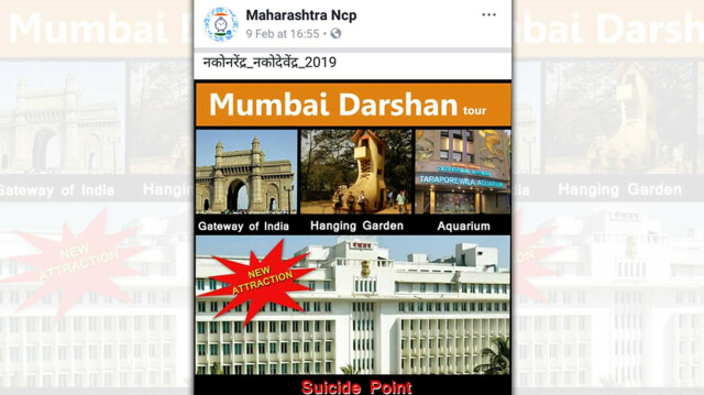 राष्ट्रवादी काँग्रेसच्या फेसबुक पेजवर 'नको नरेंद्र, नको देवेंद्र-२०१९' नावाचं कॅम्पेन सुरू करण्यात आलं आहे. त्यातल्या एका पोस्टमध्ये 'मुंबई दर्शन'साठी शहरातील काही 'टुरिस्ट स्पाॅट' दाखवण्यात आले आहेत. यांत हँगिंग गार्डन, तारापोरवाला मत्सालय, गेट वे ऑफ इंडियासोबत मंत्रालय हे चक्क 'सुसाईड पॉईंट अॅट्रॅक्शन' म्हणून दाखवण्यात आलं आहे. ज्या प्रकारे मागच्या काही दिवसांत मंत्रालयाच्या इमारतीवरून उडी मारून ३ जणांनी आत्महत्येचा प्रयत्न केला आणि त्यापैकी २ जणांनी आपला जीव गमावला. त्याकडे पाहता, खरंच मंत्रालय 'सुसाईड पॉईंट' बनतंय का? या विचाराने मनात धस्स झालं.