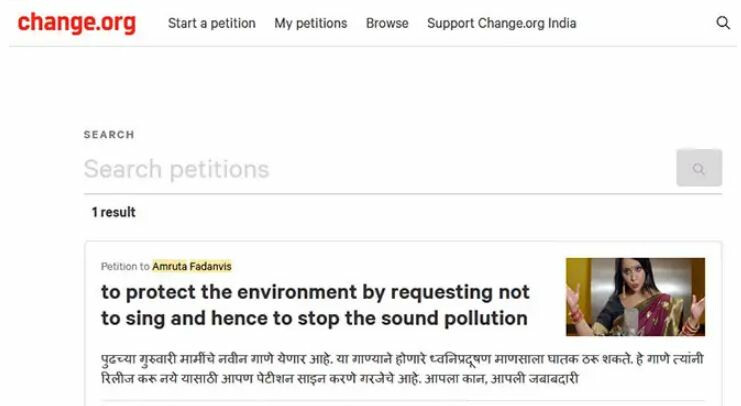 हुनमंत ढोमे नावाच्या युझरनं सोमवारी म्हणजेच १४ डिसेंबर रोजी चेंज डॉट ओआरजी या वेबसाईटवर पर्यावरणाचे सौरक्षण करण्यासाठी आणि ध्वनी प्रदूषण टाळण्यासाठी अमृता फडणवीस यांनी गाऊ नये, अशी ऑनलाइन याचिका दाखल केली आहे. अमृता यांचा या ऑनलाइन याचिकेच्या डिस्प्रिप्शनमध्ये उल्लेख मामी असाही करण्यात आला आहे.