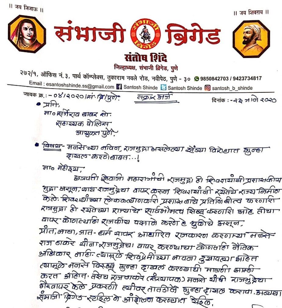 त्यामुळे शिवप्रेमींच्या भावना दुखावल्या आहेत. त्यामुळे मनसेविरूद्ध गुन्हा दाखल करण्याची आम्ही करत आहोत. तसेच राज ठाकरे (संस्थापक) मनसे यांनी राजमुद्रेचा गैरवापर केल्याप्रकरणी त्यांच्यावर तातडीने गुन्हा दाखल करावा अन्यथा संभाजी ब्रिगेड स्टाइलने आंदोलन करण्यात येईल.