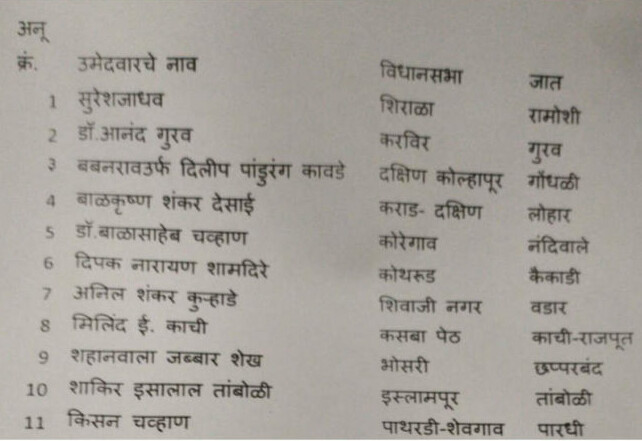 वंचित बहुजन आघाडीने एमआयएम पाठोपाठ मंगळवारी विधानसभा निवडणुकीसाठी २२ उमेदवारांची पहिली यादी जाहीर केली आहे. विशेष म्हणजे वंचितने ही यादी उमेदवारांच्या जातीसह जाहीर केली आहे. कोल्हापूर, सांगली, पुणे, विदर्भ, लातूर, जळगाव, नगरमधील जागांचा यामध्ये समावेश आहे. या यादीत ढीवर, नंदीवाले, काची-राजपूत, छप्परबंद, माना, पटवे-मुस्लिम, माडिया, मनियार आणि भिल्ला आदी वंचित समाजातील उमेदवारांचा समावेश आहे.