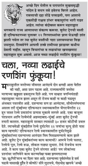 बुलेट ट्रेनची मस्ती ही एल्फिन्स्टनच्या पुलावर २२ निरपराध्यांचा प्राण घेऊनही शांत झाली नसेल तर त्या बुलेट मस्तीची नशा उतरवण्याचा विडा उचलूया. शिवसेनेने आपली शस्त्र शमीच्या झाडावर कधीच ठेवली नाहीत. म्हणून विचारांचा आणि लढायांचा खणखणाट महाराष्ट्रात सुरू असतो. आज नव्या लढाईचे रणशिंग फुंकूया! असेही सामनाच्या संपादकीयामध्ये म्हटले आहे.