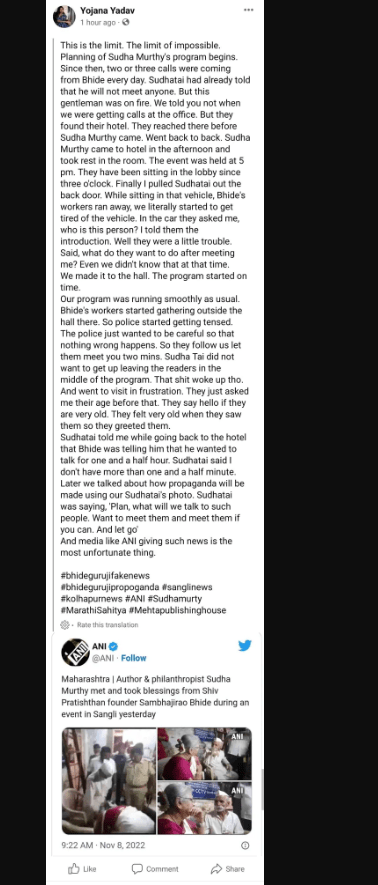 मेहता पब्लिकेशनच्या योजना यादव यांनी फेसबुकवरुन सुधा मूर्ती यांची भेट संभाजी भिडे आणि त्यांच्या समर्थकांनी अगदी हट्ट करुन घेतल्याचं म्हटलं आहे.