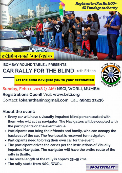 'राऊंड टेबल ब्लाईंड मॅन'च्या वतीनं १२व्या कार रॅलीचं आयोजन करण्यात आलं आहे. रॅलीमधल्या गाड्या डोळस व्यक्तीद्वारे चालवण्यात येत असल्या तरी त्यांना रॅलीचा नकाशा, मार्ग दृष्टीहीन व्यक्ती सांगणार आहेत. दृष्टीहीन व्यक्ती चालकाच्या बाजूच्या सीटवर बसेल. रॅली ज्या मार्गानं जाईल, त्या मार्गाचा नकाशा बनवण्यात आला आहे. या नकाशानुसार दृष्टीहीन कार चालकाला मार्गदर्शन करेल. या रॅलीला सेलिब्रिटींचा देखील पाठिंबा असतो.