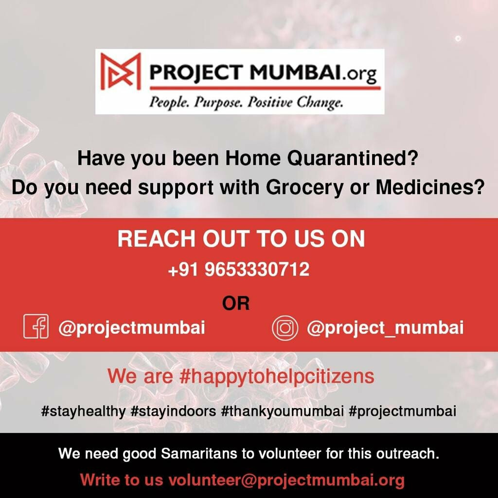 त्याकडे लक्ष देण्याच्या उद्देशानं, मुंबई-आधारित असोसिएशननं 'प्रोजेक्ट मुंबई' हा उपक्रम सुरू केला आहे. याअंतर्गंत किराणा आणि औषधे तुम्हच्या घरापर्यंत पोहोचवली जातील. यासाठी तुम्ही राहत असलेल्या परिसरातील काहींना वॉलेंटियर म्हणून या प्रोजेक्ट मुंबईमध्ये सहभागी केलं जाईल. शिशिर जोशी यांच्या अध्यक्षतेखालील या स्वयंसेवी सेवेमध्ये वॉलेंटियर्स सहभागी केले जातील.