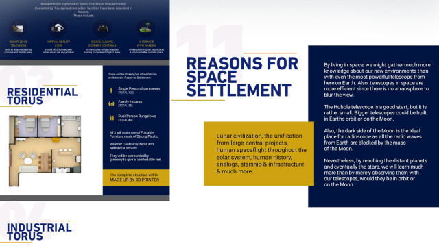 रोजच्या जगण्यासाठी या स्पेसरुपी शहरात आवश्यक वातावरण तयार करण्यात येईल. मनोरंजनासाठी अर्ध-गुरुत्वाकर्षण असणारे फुटबॉल स्टेडिअम तयार करणे, तसेच शेती अशा अनेक सुविधांचा या संशोधनामध्ये समावेश करण्यात आला आहे.