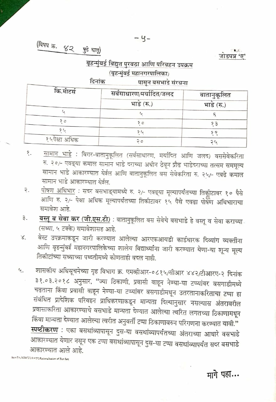 आर्थिक संकटात असलेल्या बेस्ट उपक्रमानं प्रवासी संख्या आणि उत्पन्न वाढविण्यासाठी नव्या भाडेदराचा प्रस्ताव तयार केला आहे. या प्रस्तावास मंगळवारी झालेल्या बेस्ट समितीच्या बैठकीत मंजूरी मिळाली आहे. त्यामुळं या प्रस्तावानुसार, आता ५ किलोमीटर अंतरासाठी किमान भाडं ५ रुपये निश्चित करण्यात आलं आहे. एसी बसच्या पहिल्या टप्प्यासाठीही केवळ ६ रुपये तिकीट आकारलं जाणार आहे. सध्यस्थितीत या प्रस्तावाची अंमलबजावणी कधीपासून करणार याची माहिती मिळालेली नाही. मात्र, बेस्टच्या या निर्णयामुळं प्रवाशांना मोठा दिलासा मिळाला आहे.