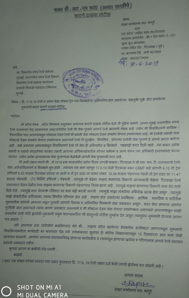 टिटवाळ्याचे रहिवासी शेखर कापुरे यांनी गुरुवारी आपल्या सहप्रवाशांसह मध्य रेल्वेला अल्टिमेटम दिला आहे. मध्य रेल्वेमुळं रोजच लेट मार्क लागत असल्याची तक्रार त्यांनी केली आहे. त्यामुळं १० दिवसांत या नोटिशीला उत्तर न दिल्यास आक्रमक पवित्रा घेण्याचा इशारा प्रवाशांनी दिला आहे.