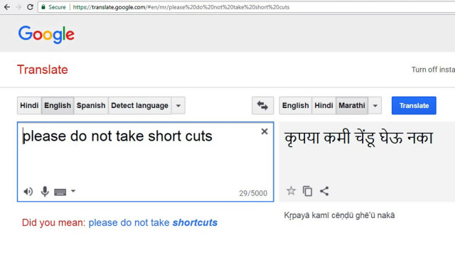 याचा अधिक शोध घेतला असता या वाक्याचं मूळ इंग्रजी वाक्य सापडलं. हे मूळ इंग्रजी वाक्य होतं Please do not take short cuts! आता ज्यानी कुणी हे इंग्रजीचं मराठी भाषांतर केलं, त्यानं नक्कीच त्यासाठी गुगल ट्रान्स्लेटरची मदत घेतली असणार. कारण गुगल ट्रान्स्लेटरमध्ये या वाक्याचा शब्दश: अर्थ होतो 'कृपया लहान चेंडू घेऊ नका'! आता काय म्हणावं रेल्वेच्या या हास्यास्पद चुकीला!