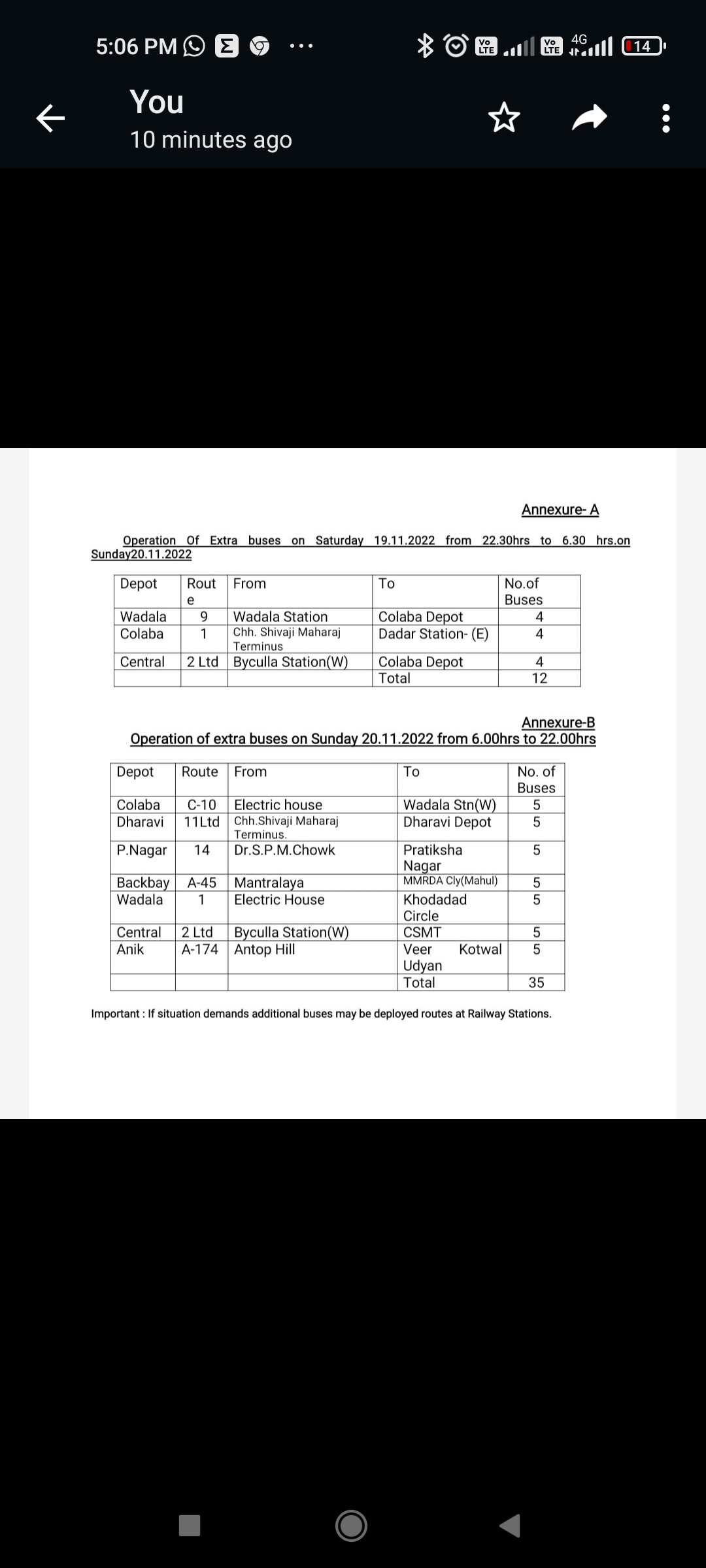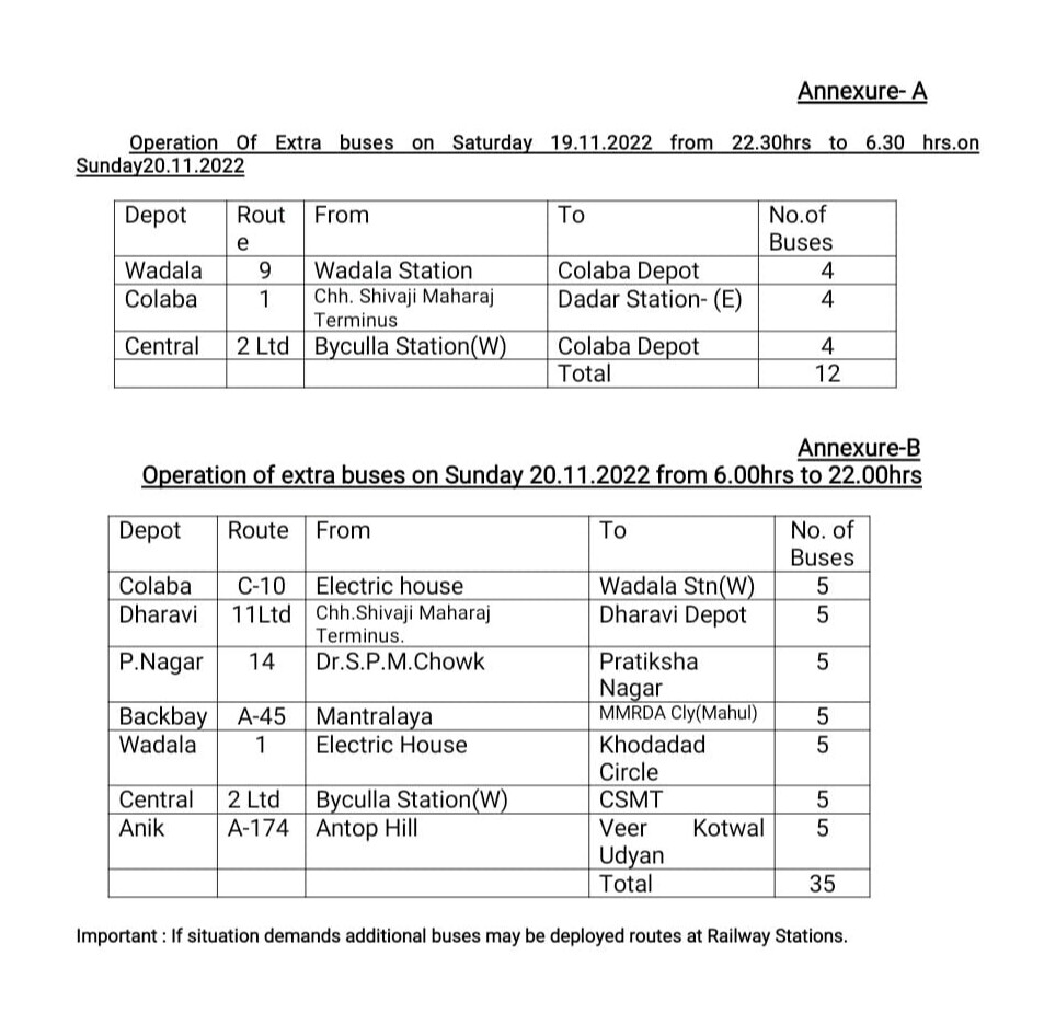 तसेच रविवारी सकाळी ६ ते रात्री १० वाजेपर्यत इलेक्ट्रिक हाऊस- वडाळा (प), सीएसएमटी- धारावी डेपो, मुखर्जी चौक- प्रतीक्षा नगर, मंत्रालय- माहुल, इलेक्ट्रिक हाउस- के सर्कल आणि अँटॉप हिल- कोतवाल उद्यान या मार्गावर ३५ जादा बस सोडण्यात येणार असल्याचे बेस्टकडून सांगण्यात आले.