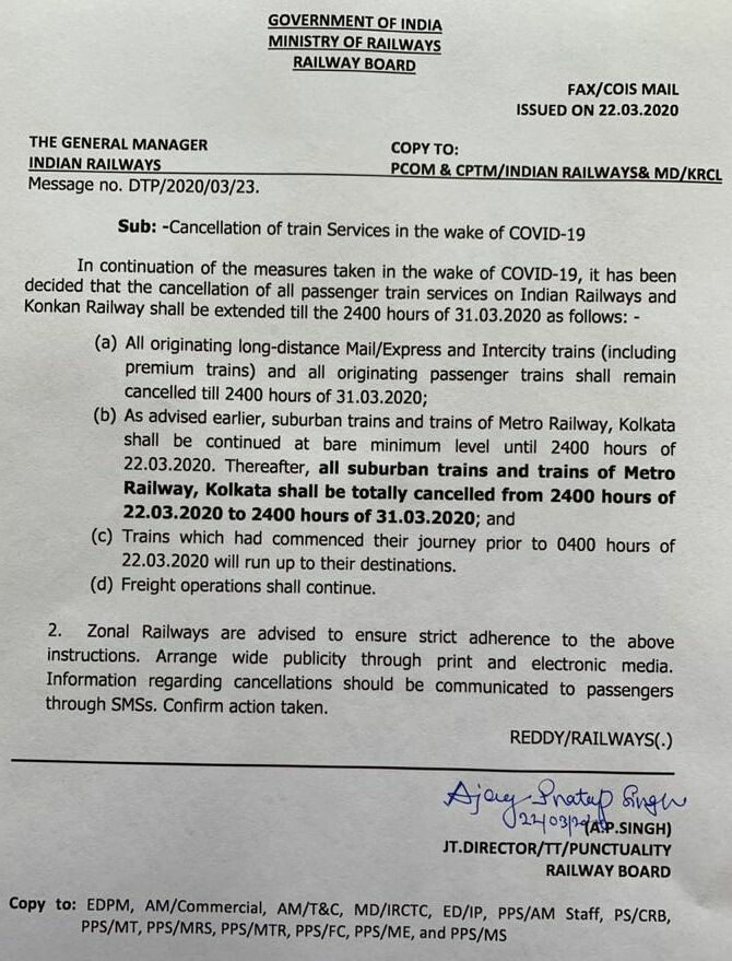 रेल्वे मंत्रालयाच्या पत्रकानुसार, करोना व्हायरस रोखण्यासाठी करण्यात आलेल्या प्रयत्नांचा एक भाग म्हणून रविवारी मंध्यरात्रीपासून ३१ मार्चपर्यंत देशातील सर्व प्रवासी रेल्वे सेवा बंद करण्यात येत आहे.
