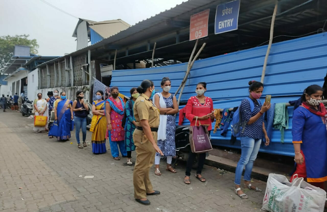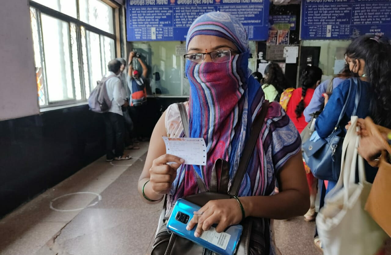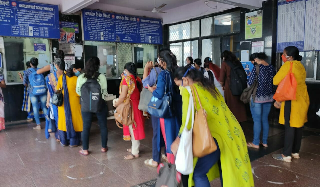 रेल्वे प्रवासासाठी तिकीट खिडकीबाहेर महिलांची मोठी रांग लागली आहे.