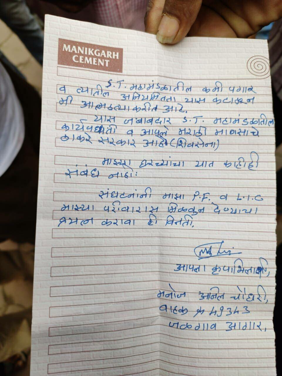 मनोज चौधरी जळगावमधील कुसुम्बा गावातील रहिवासी होते. त्यांनी आपल्या सुसाईड नोटमध्ये म्हटलं आहे की, ‘एसटी महामंडळातील कमी पगार व त्यातील अनियमितता यास कंटाळून मी आत्महत्या करीत आहे. यास जबाबदार एसटी महामंडळातील कार्यपद्धती व आपले मराठी माणसाचे ठाकरे सरकार आहे (शिवसेना). माझ्या घरच्यांचा यात काहीही संबंध नाही. संघटनांनी माझ्या पीएफ आणि एलआयसी विमा हा माझ्या कुटुंबाला मिळवून देण्याचा प्रयत्न करावा’ असं मनोज चौधरी यांनी चिठ्ठीत लिहिलं आहे.