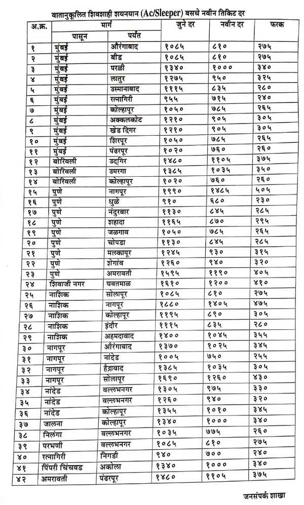 महाराष्ट्र राज्य मार्ग परिवहन महामंडळा(एसटी)च्या वातानुकूलित शिवशाही शयनयान (AC Sleeper) बसमधून प्रवास करणाऱ्या प्रवाशांसाठी खुशखबर आहे. वातानुकूलित शिवशाही शयनयान बसचा तिकीट दर कमी करण्यात आला आहे. राज्य परिवहन प्राधिकरणाच्या मंजूरीनंतर एसटी महामंडळाने दर कपात केली आहे.
