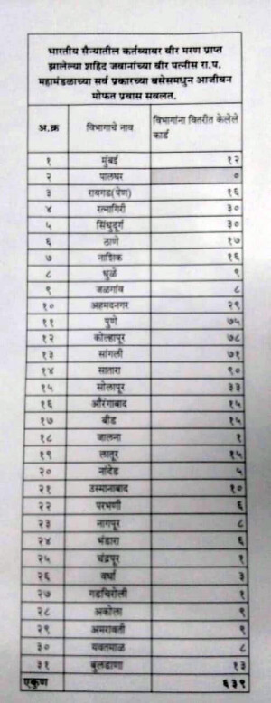 मुंबईसह, कोल्हापूर, सातारा, पुणे, सांगली, सोलापूर यासारख्या महाराष्ट्रातील ३१ शहरातील ६३९ वीरपत्नींना हे आजीवन मोफत एसटी प्रवासाचे पास देण्यात आले आहेत. अशा प्रकारे शहिदांचा सन्मान करणारे महाराष्ट्र राज्य मागे परिवहन महामंडळ ही एकमेव प्राधिकरण असल्याचं एसटी महामंडळानं सांगितलं आहे.